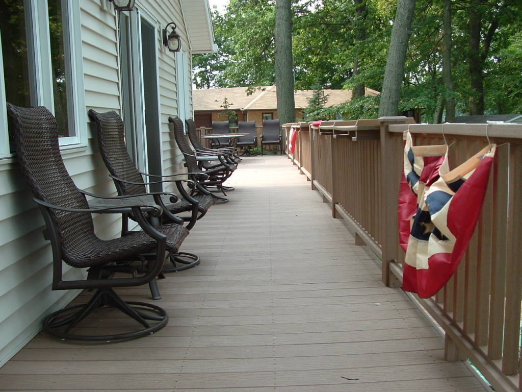 The long deck with many chairs is a wonderful place to sit and relax on those hot summer days.