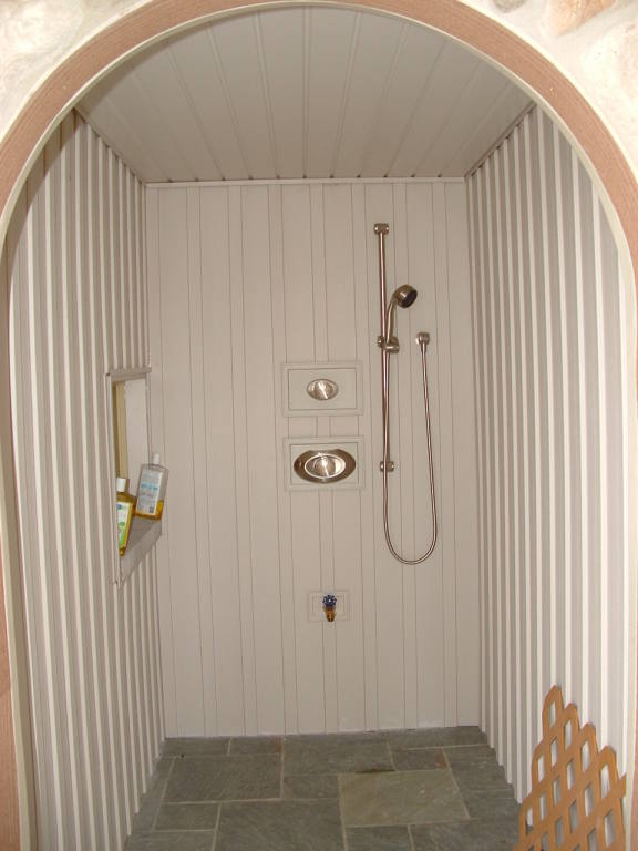 An outdoor shower washes away the beach sand.